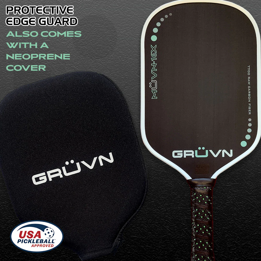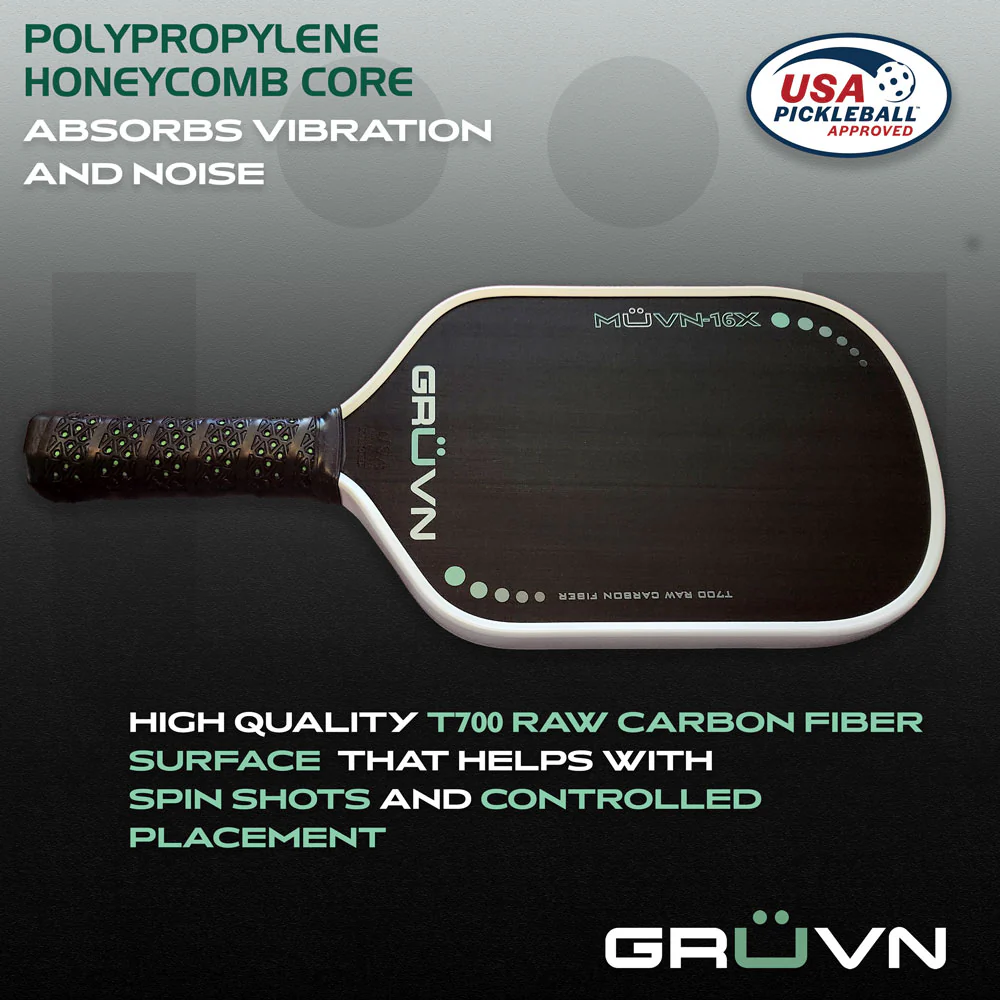 Featuring GRÜVN’s signature T700 raw carbon fibre face and a midweight balance (~227g), the MUVN-16X Pickleball Paddle is ideal for intermediate to pro-level players who thrive in aggressive rallies and high-pressure scenarios. The paddle’s sleek mint finish with a crisp white edge guard adds visual confidence to every serve, dink, or drop shot.